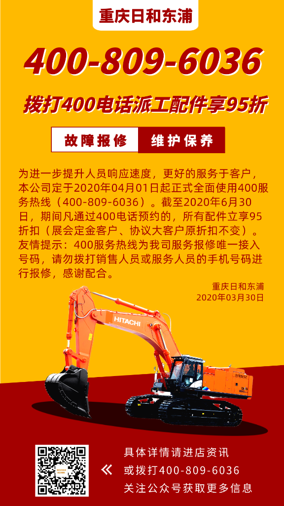 通知:重慶日和東浦4月1日起正式全面使用400服務(wù)熱線,更可享受優(yōu)惠折扣哦! 2020.03.30 返回列表 上一篇 2020.04.03 探索ZX690LCH-5A挖掘機(jī),省油高效新旗艦! 下一篇 2020.03.16 超級會員日,大家齊加油! 熱門新聞 慶祝六一兒童節(jié) 2023-06-02 不是吧阿Sir? 7折耶! 2020-08-31 除了七夕和愛情還有日立ZX330-5A! 2020-08-26 @您,出大事啦! 2020-07-20 夏日炎炎,請接收這一份如影隨行的清涼! 2020-07-13 離職公告 2020-06-24 終于等到你,為你虧本也樂意! 2020-06-17 “夏不為利,后惠無期” 2020-06-17