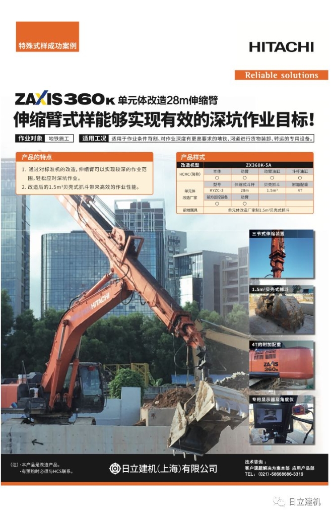 為滿足這一需求,日立建機推出了專業(yè)性更強的伸縮臂挖掘機,通過伸縮型工作裝置,可以達到28-30米的垂直作業(yè)深度。1.5立方的貝殼斗可以大大增加機器的作業(yè)效率。同時,在機器上加裝了攝像頭及角度儀等輔助設(shè)備,進一步提升作業(yè)效率及安全性。